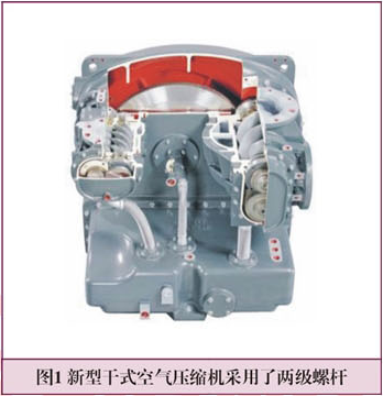 正是这一特点导致了干式运行的空压机消耗的能源明显高于其它类型的压缩机。近年来,借助于不断发展的空压机技术以及持续进步的空压机零部件技术,在 2012 年,干式运行空压机的输出能力有了显著提升。空气压缩机的核心部件被替换为新型的坚固耐用的两级螺杆(见图 1 )。涂层材料由寿命更长且更耐磨蚀的涂层材料代替了会降低压缩机比功率的特氟龙涂层,即使长年使用也不会出现可见的磨损痕迹。
