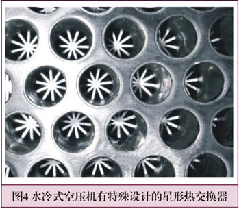 空压机的压缩空气脉动阻尼器也有了改进和创新。用脉动缓冲器取代文丘里管,几乎将压缩空气的损失降到了更低,从而明显提高了空气压缩机的功率输出。另外,新型的冷却介质也提高了空压机的性能,这不仅包括配置了星型热交换器的水冷式空压机(见图4)