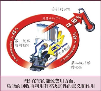 空气压缩机的优化和改进仅仅是提高压缩空气生产时能源利用率任务中的一部分。一些次要因素和进一步性能改进也是非常重要的因素,如热能的回收再利用(见图5)