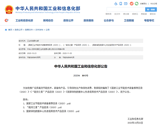 早在2020年10月23日,中华人民共和国工业和信息化部发布的2020年第40号公告:为加快推广应用高效节能技术、装备和产品,引导绿色生产和绿色消费,我部组织编制了《国家工业节能技术装备推荐目录(2020)》《“能效之星”产品目录(2020)》《国家绿色数据中心先进适用技术产品目录(2020)》,现予公告。日韩不卡免费视频节能科技(上海)股份有限公司两款装备(产品)入选(详见工信部网站公示,2020年10月23日的《国家工业节能技术装备推荐目录(2020)》《“能效之星”产品目录(2020)》公示页面,附件1中第66页、附件2中第24页)。